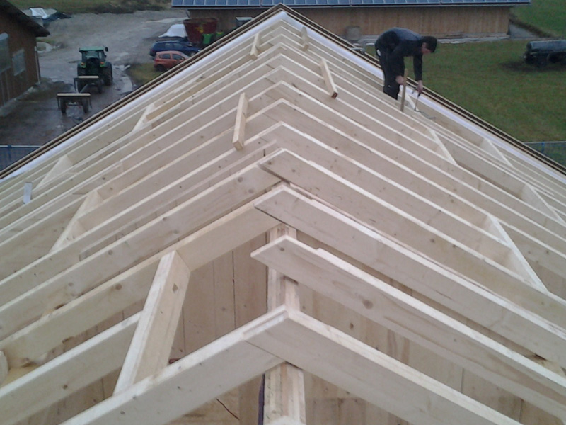 Beim sichtbaren Dachstuhl sind alle Konstruktionsteile wie Sparren und teilweise auch die Pfetten, Grat-, Kehlsparren, Auswechslungen sichtbar gehobelt. Für die Konstruktionsbalken verwenden wir hochwertiges Leimholz bzw. Duoholz. Dadurch wird die Rissbildung gemindert und die Holzteile haben auch nach vielen Jahren noch die gleiche Dimension. Um einen optimalen Übergang von Wand zu Dach zu schaffen bauen wir beim Sichtdachstuhl den sogenannten „doppelten Dachstuhl“. Diese Variante ist energetisch optimiert und ergibt einen schlanken Dachaufbau im Vordachbereich. Auf die Konstruktionsbalken wird eine Dachschalung aus nordischem Fichtenholz im Nut- und Federsystem montiert. Beim Sichtbaren Dachstuhl kommt die Dämmung der Dachfläche auf die Dachschalung und das Dach ergibt so eine gedämmte Scheibe.