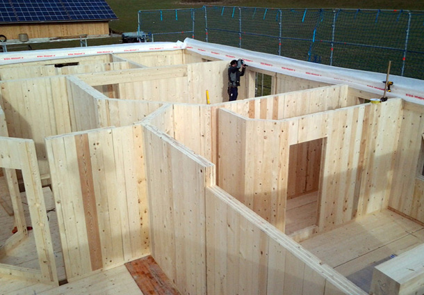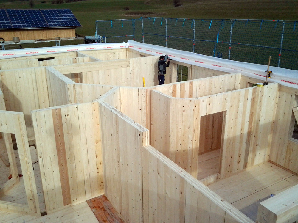 Für die Außenwände verwenden wir die Wandstärke von 24,5cm und für die Innenwände je nach statischen Vorgaben Wandstärken von 11cm bis 20,5cm. Durch die vorher ausgeklügelte CAD Planung geht die Montage der Wände ziemlich flott voran. Die Wände werden nach den durchnummerierten Positionsplan an die richtige Stelle montiert und dann miteinander verschraubt. Die genauere Beschreibung der massiven Holzwände finden sie hier (link)