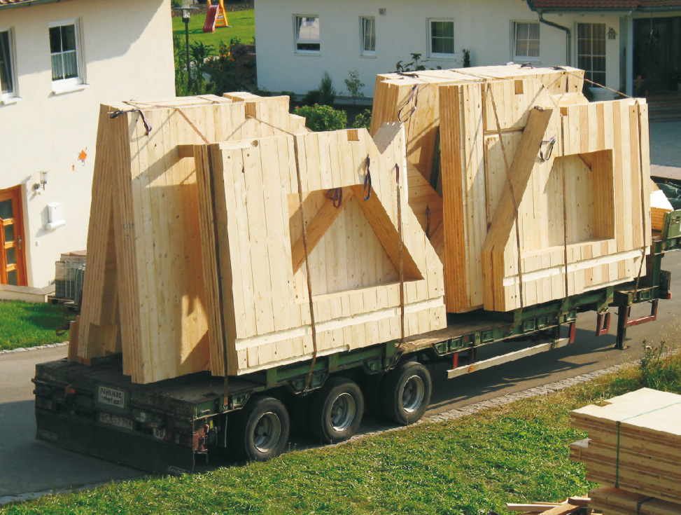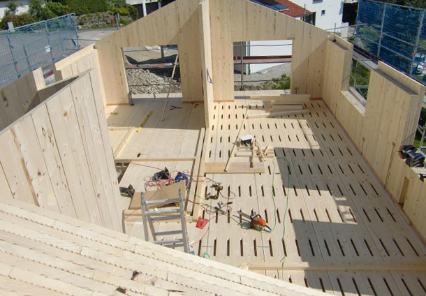 Über die Wände jeden Geschosses kommt ein umlaufender Leimholzbalken zum liegen, um die Lasten der verschiedenen Deckensysteme sauber in die Wände einzuleiten. Auf der montierten Decke wird ein neuer Schwellenkranz montiert um den Wänden die richtige Richtung vorzugeben. Danach werden die Wände des nächsten Stockwerks montiert. So lange, bis wir am Dach angelangt sind.